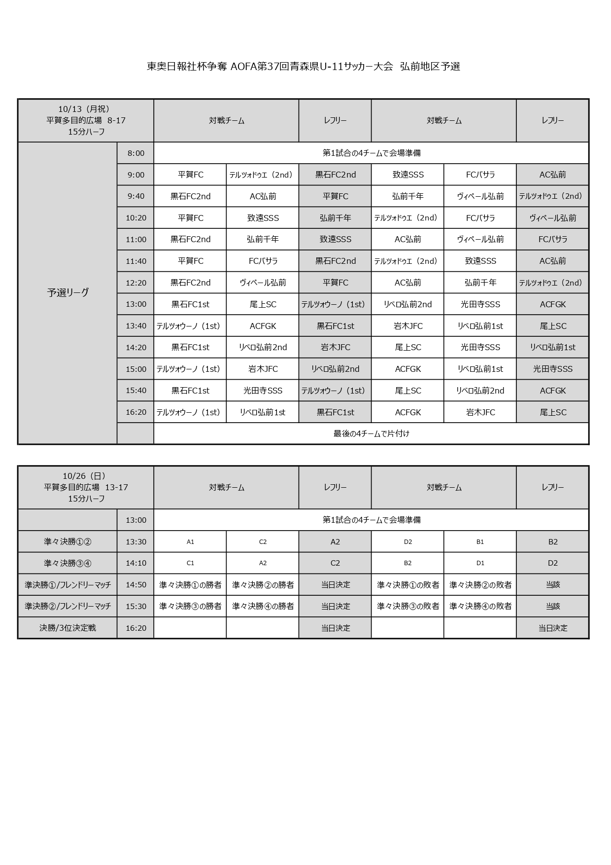 令和7年10月13日(月祝)、26日(日)に行われる東奥日報社杯争奪AOFA第37回青森県U-11サッカー大会弘前地区予選の組合せです。
